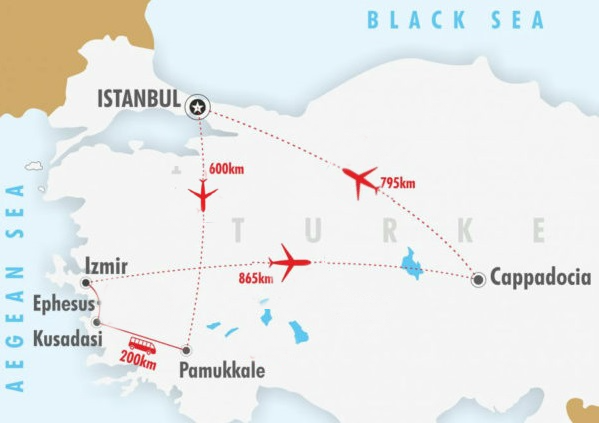 A: The itinerary may vary depending on the tour operator, but it typically includes visits to historical and cultural sites in Istanbul, visit to underground cities in Cappadocia, a visit to the ancient city of Ephesus, and a visit to the thermal springs and terraces of Pamukkale.